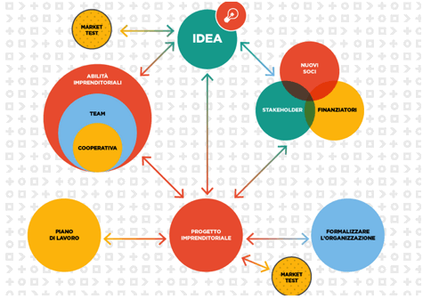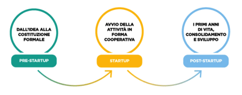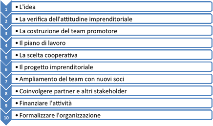 Il percorso proposto parte dall’idea e giunge fino alla creazione della startup cooperativa. Si tratta di un percorso logico strutturato in dieci fasi: